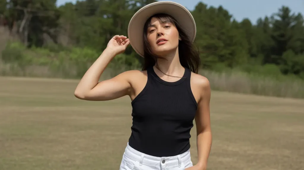 There’s something almost calming about an outfit built entirely on neutrals. A fitted tank top paired with tailored light shorts creates a silhouette that feels clean, understated, and incredibly wearable. This kind of simplicity is defining so many summer 2026 outfit ideas right now.