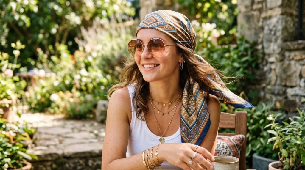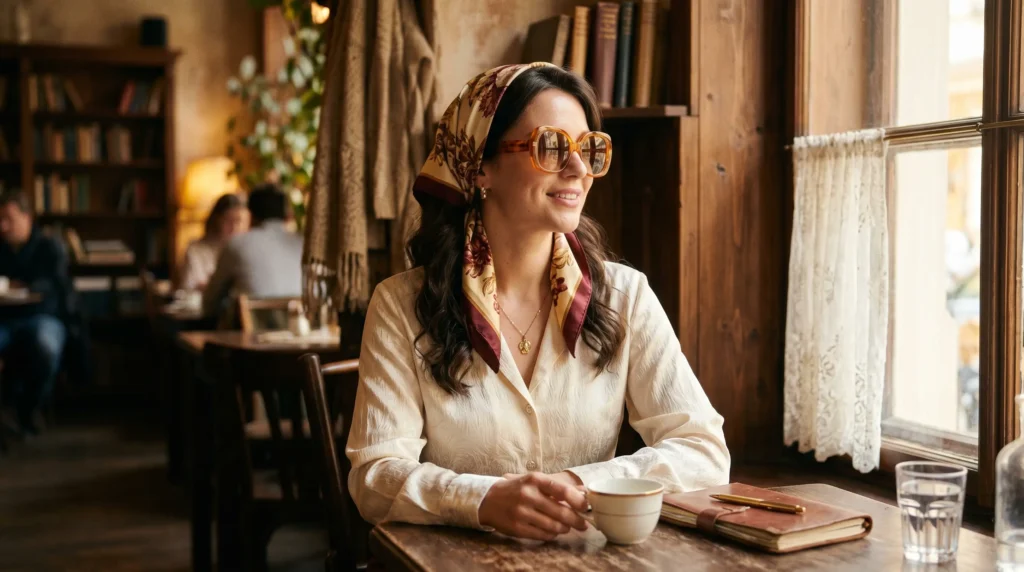 The final style is quietly cinematic. A silky blouse with a soft tie neckline, a printed scarf wrapped around the hair, and oversized amber sunglasses that frame the face with warmth and real depth. Everything feels curated without feeling forced.