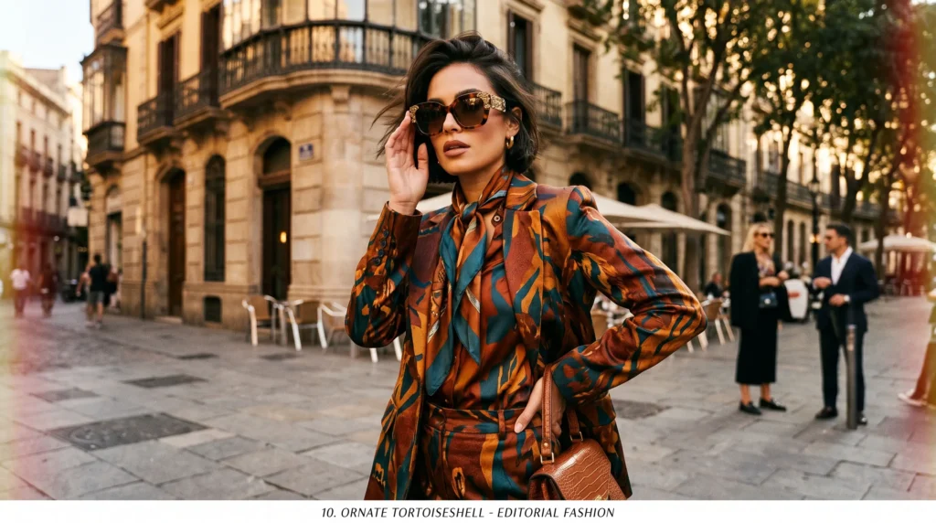 | Golden Hour Glam with Geometric Frames | Geometric brown lens | Oval, heart | Elevated & photogenic |