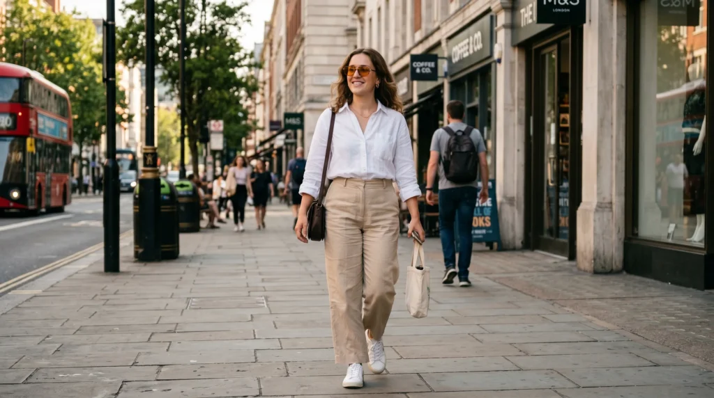 Here, they’re paired with a crisp white button-down and relaxed beige trousers. The combination is structured but not stiff. It works from a work lunch to a weekend plan without any adjustment.