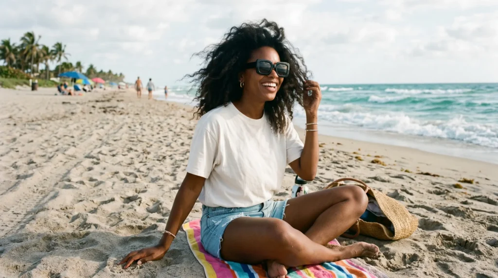 | Relaxed Beach Days with Oversized Black Frames | Wrap oversized black | All shapes | Casual & reliable |