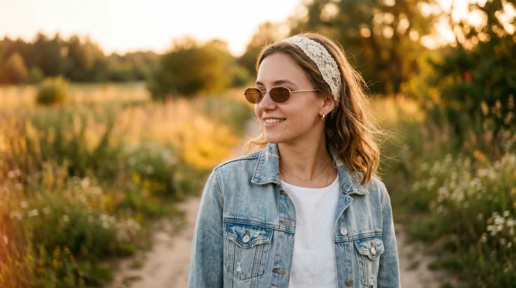 There’s a shift happening in women’s sunglasses 2026 toward delicate frames that let your features show through. This look captures that perfectly. A lace headband, layered gold necklaces, structured denim — and barely-there thin frames that sit quietly but confidently on the face.