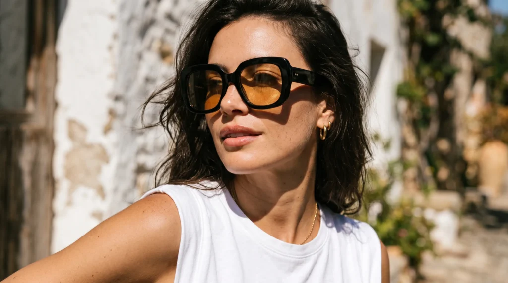 This is the kind of summer sunglasses look that doesn’t need to try. A fitted white tank, a geometric headscarf, layered gold jewelry, and a slightly oversized pair of warm-toned gradient frames that soften the face without hiding it. The whole thing reads intentional without being overdone.