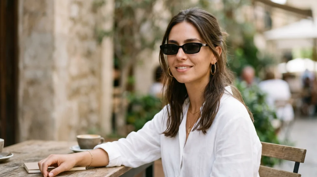 This is quiet luxury in sunglasses form. A lightweight white blouse, bold narrow black frames with precise proportions, simple gold hoops. The whole look is clean, polished, and completely effortless — the kind of thing that looks like you planned it when you actually didn’t.