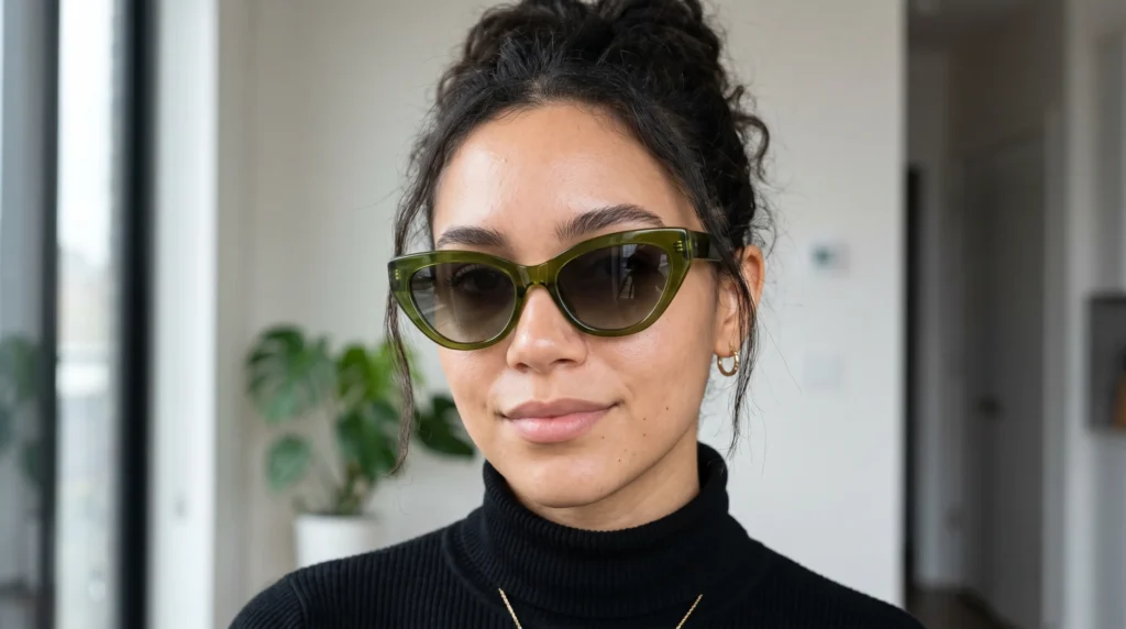 Now here’s where it gets interesting. Green frame sunglasses are having a genuine moment in 2026, and this glossy olive-green cat-eye with subtle gold temple detailing is one of the most wearable versions of that trend. Paired with a sleek black top, it sits right between neutral and statement — the sweet spot.