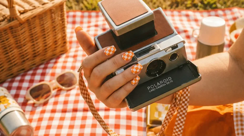 Alternating tangerine and white squares create a fun, retro pattern that feels totally summery. This works best on square-shaped nails to really show off the grid.
