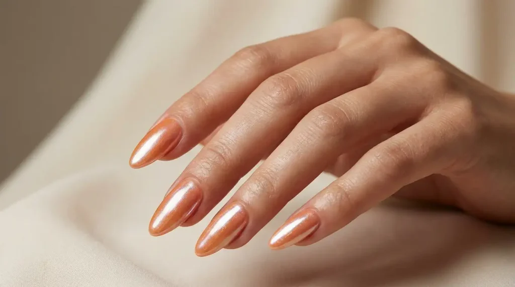 Chrome powder over tangerine creates this futuristic, metallic finish that catches light like crazy. It’s bold, it’s different, and it’s definitely a conversation starter.