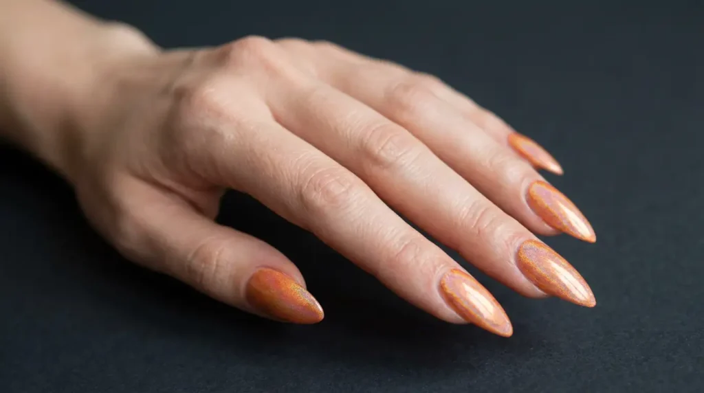 Holographic powder or polish over tangerine creates a rainbow shimmer effect that shifts in the light. It’s like summer magic on your nails.