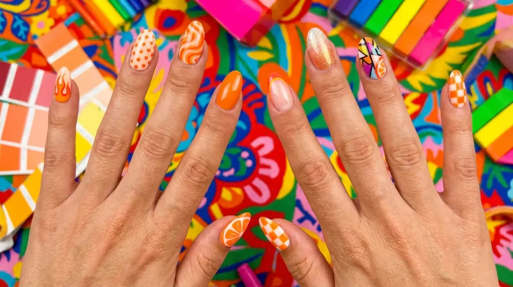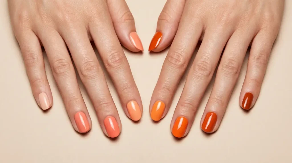 Each nail painted a slightly different shade of orange—from pale peach to deep tangerine—creates a gradient across your whole hand.