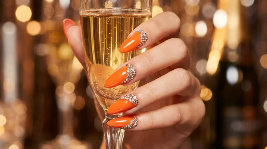 Add gold accents, rhinestones, or chrome finishes to dress up tangerine nails. The color is already eye-catching, so a little extra detail makes it event-ready.