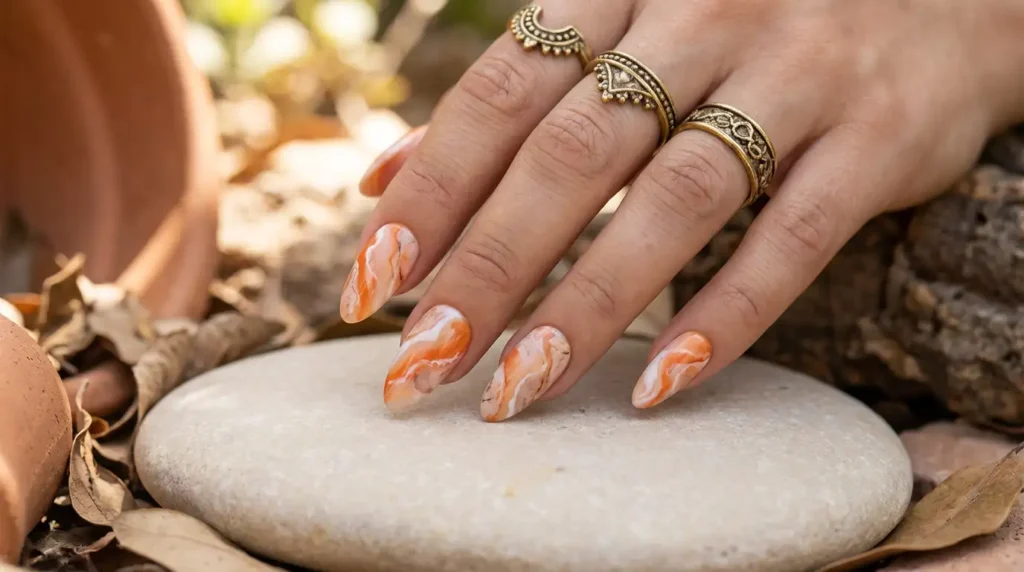 Swirls of white, peach, and tangerine create a marble effect that looks way more expensive than it actually is. This design feels artistic and elevated.