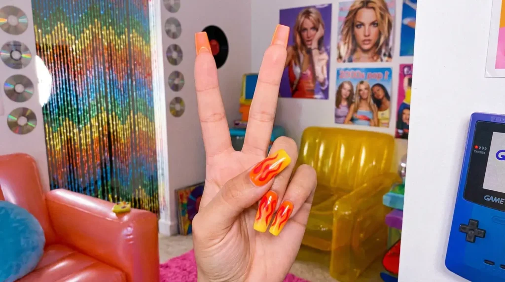 Y2K nostalgia meets summer nails. Flame designs in tangerine and darker orange create that retro-cool aesthetic everyone’s loving right now.
