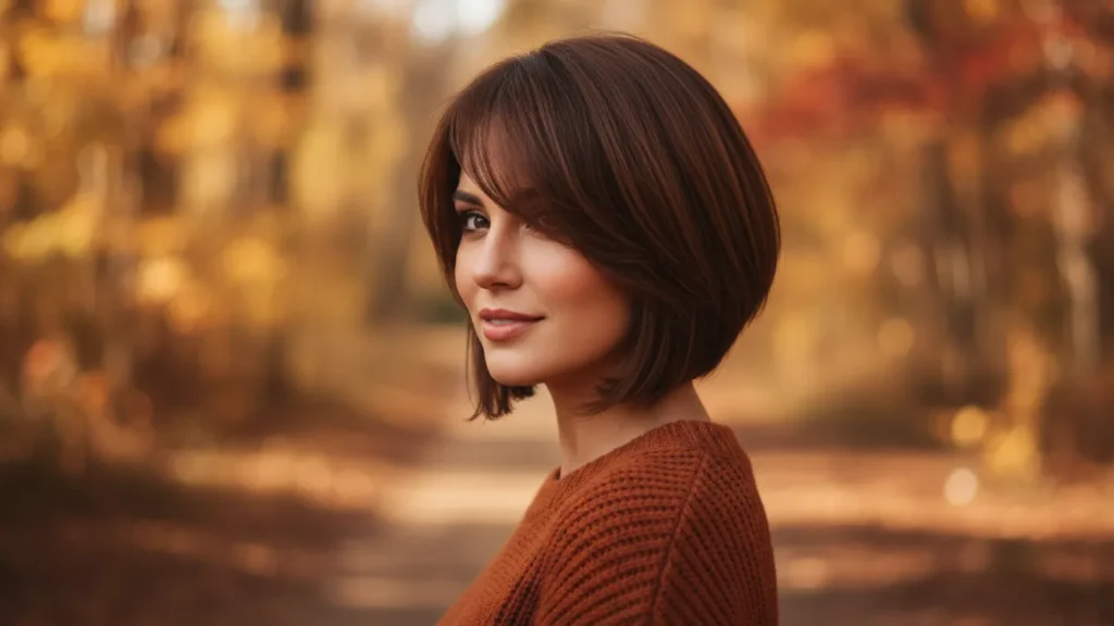 Looking for something warm and cozy? This chestnut brown 90s bixie cut has this gorgeous reddish undertone that feels so autumnal and rich. The side-swept part and long bangs add softness around your eyes and cheekbones.