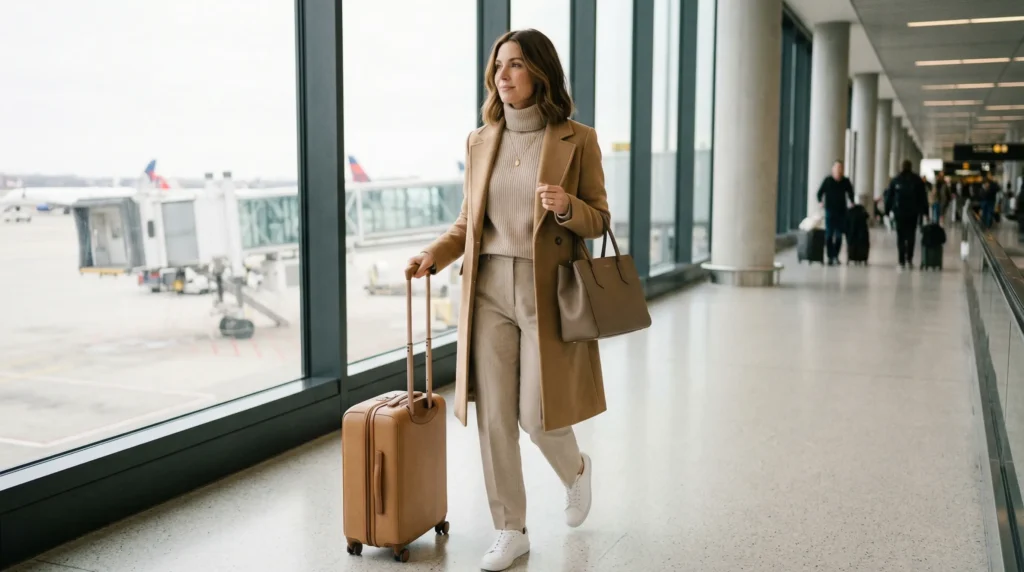 A neutral color palette has become the foundation of the best airport outfits for women in 2026. Shades like black, camel, cream, grey, and navy dominate travel wardrobes because they simplify styling and make outfits appear cohesive without requiring much thought. This camel-on-camel approach is the purest expression of that philosophy.