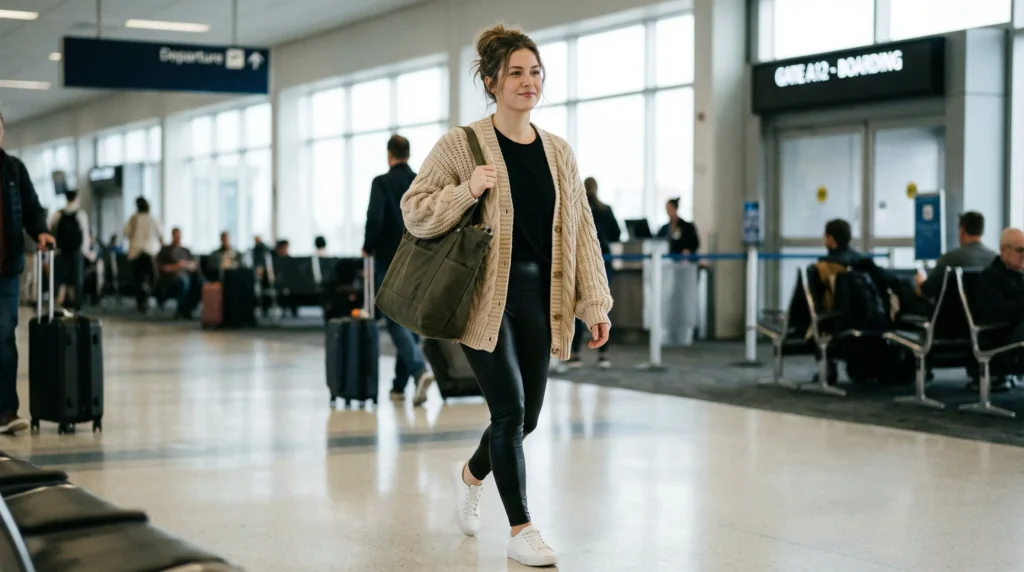 A thick beige cardigan over a black top with faux-leather leggings and white sneakers. This is comfort and shine together — the loose knit mocks the smooth leather, the white sneakers bridge the two textures, and the result is an outfit that’s relaxed enough for early morning flights but textured enough to photograph well.