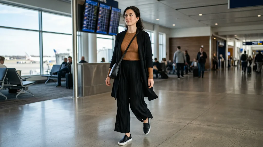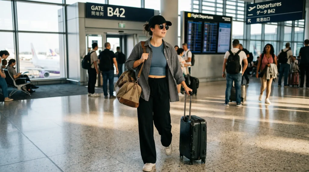 Add sneakers for comfort or ankle boots for arrival. Add a crossbody bag for hands-free movement. This outfit won’t make anyone stop you in the terminal to ask where it’s from — but it will make you feel grounded and capable from check-in to landing.