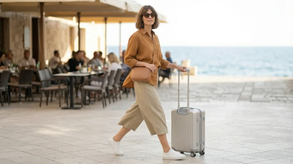 Oversized sunglasses and a smooth structured bag add the finish. A lightweight trench or linen shirt in your carry-on means you’re ready for wherever the temperature shifts. This travel outfit belongs equally to coastal explorations and city strolls.