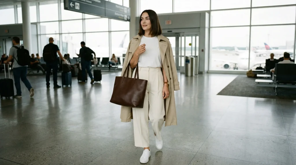 A crisp white tee. Cream wide-leg trousers. White sneakers. A large, structured deep-brown leather bag as the statement. This is the airport outfit that requires the least styling and creates the strongest impression — because the whole thing is built on proportion and simplicity rather than decoration.