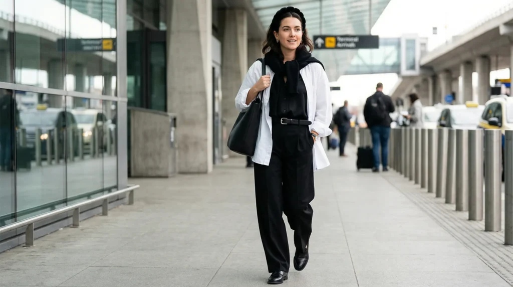 A leather jacket or trench coat in colder climates finishes it completely. This is the airport style for the traveler who wants to feel capable and expressive simultaneously — practical, but unmistakably fashionable.