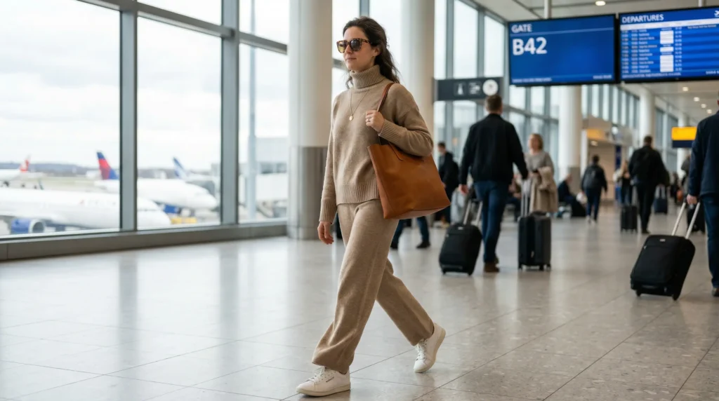 You might be wondering if this is too polished for a red-eye. It isn’t. The layering keeps it comfortable enough for sleeping and stylish enough to walk directly from arrivals into a brunch with friends. Add an oversized headband or a soft knit scarf and the transition between plane and city is completely seamless.