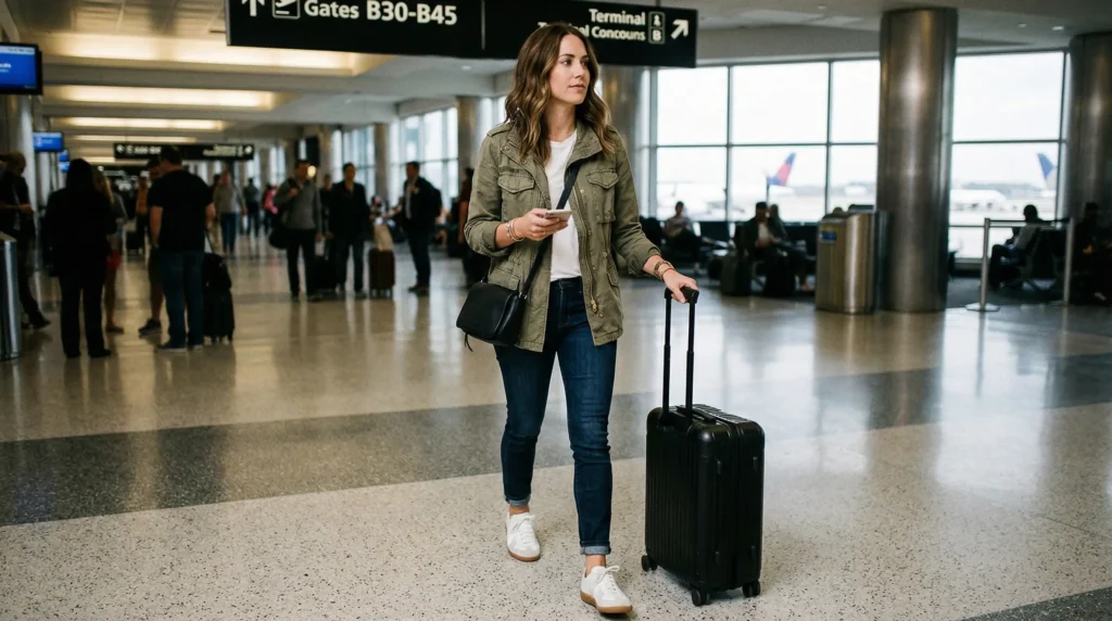 Now here’s where it gets interesting: this specific combination — utility outer layer, slim denim, clean base — is among the most consistently recommended airport outfits by women who travel frequently. It’s the grab-and-go formula that works for morning flights, layovers, and weekend getaways without requiring any planning.