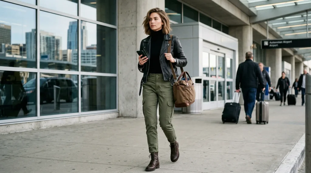 A fitted black turtleneck tucked into olive-green cargo pants, finished with brown lace-up boots and a matching tote. This combination is down-to-earth, city-ready, and quietly edgy in the best possible way. The pockets aren’t decoration — they’re genuinely useful on a travel day when you need your hands free.