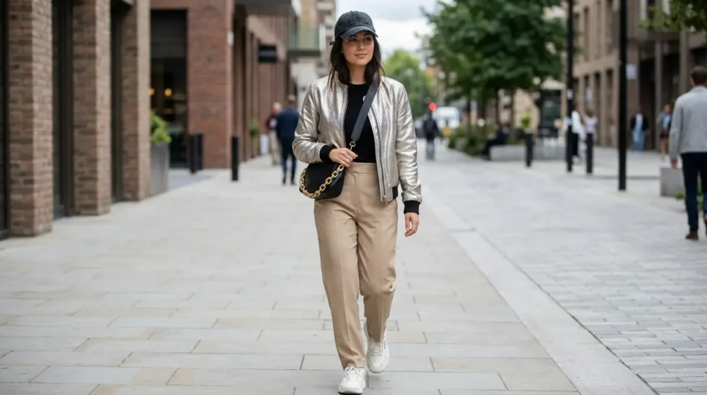 A shimmering bomber jacket over a plain black top with high-waisted beige tailored trousers. A cap with attitude and a crossbody bag with a substantial chain. This is athleisure 2.0 — the version that fashion editors are calling elevated comfort, where high-quality materials meet loose, confident cuts.