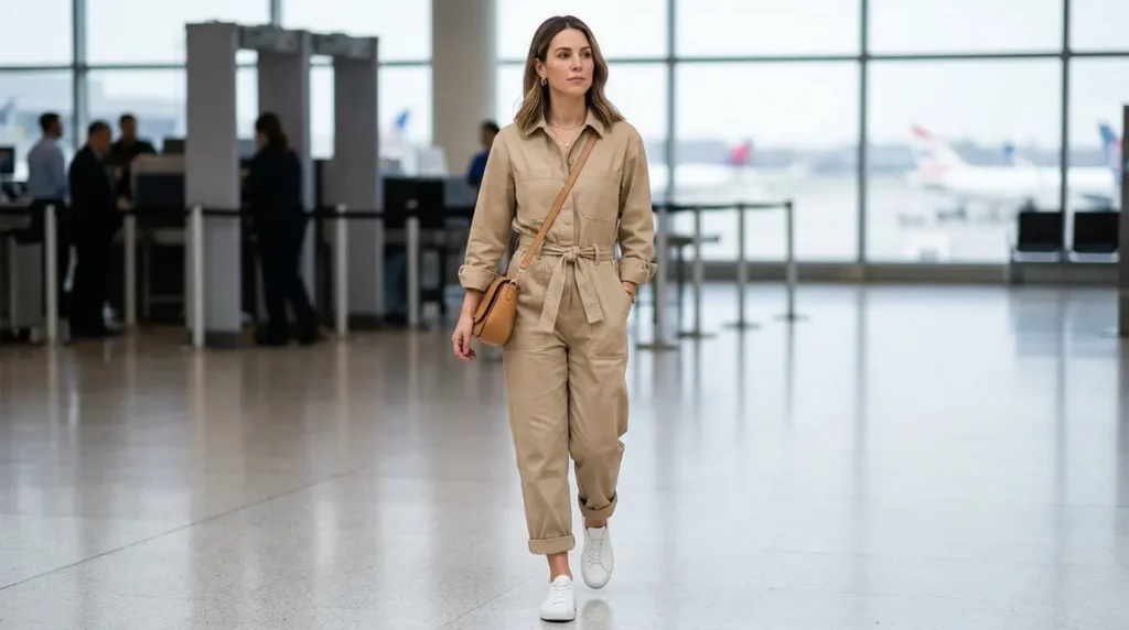 Mixing relaxed pieces with more structured layers helps create an outfit that feels intentional while still allowing for movement and comfort throughout the day. The jumpsuit does all of that in a single garment — which is why it’s one of the most reliable airport outfit formats in 2026.