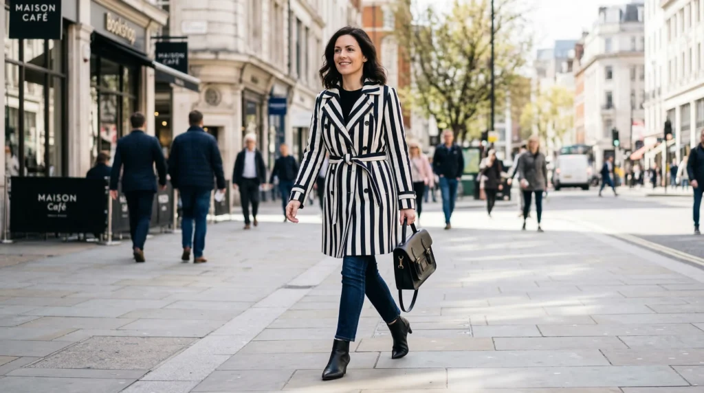 A belted coat with clean lines and bold striping delivers real authority without feeling heavy. This is one of the stronger spring fashion trends 2026 — the idea that outerwear can be both sharp and practical on an unpredictable day.