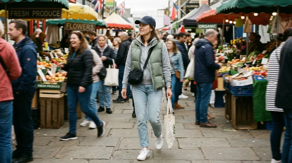 Sporty Vest LayersTravel & errandsPadded vest, hoodie, clean denimRelaxed & practical