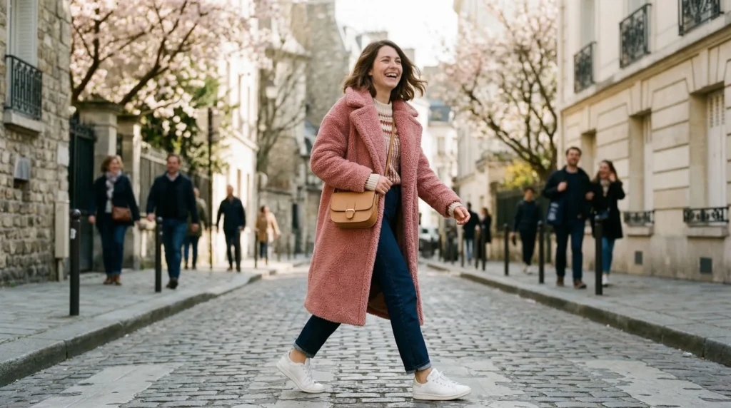 A plush pink coat is pure emotional armor. It’s bold, it’s comforting, and it makes cold spring mornings feel a lot less grim. That’s trending cold spring outfit 2026 layered looks energy at its most honest — using clothes to actually change how you feel.