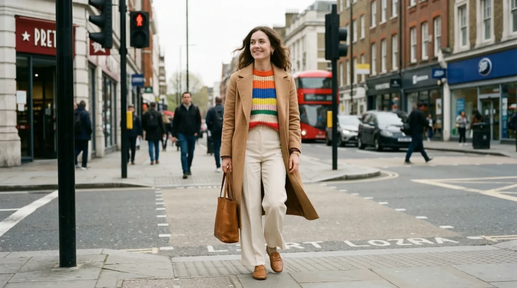 Color BlockingNeutral-heavy daysStriped knit, camel coat, cream trousersFun & balanced