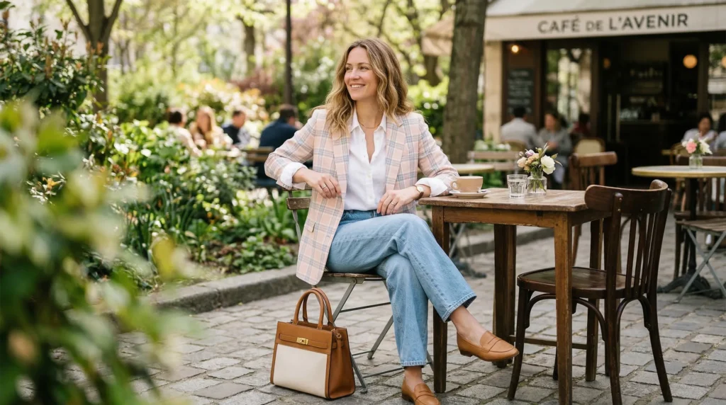 Let’s finish where everything feels effortlessly cool. A softly tailored check blazer over a crisp white shirt and wide-leg denim is exactly the right combination for the era of casual spring layering. It’s structured enough to feel intentional. It’s relaxed enough to feel human.