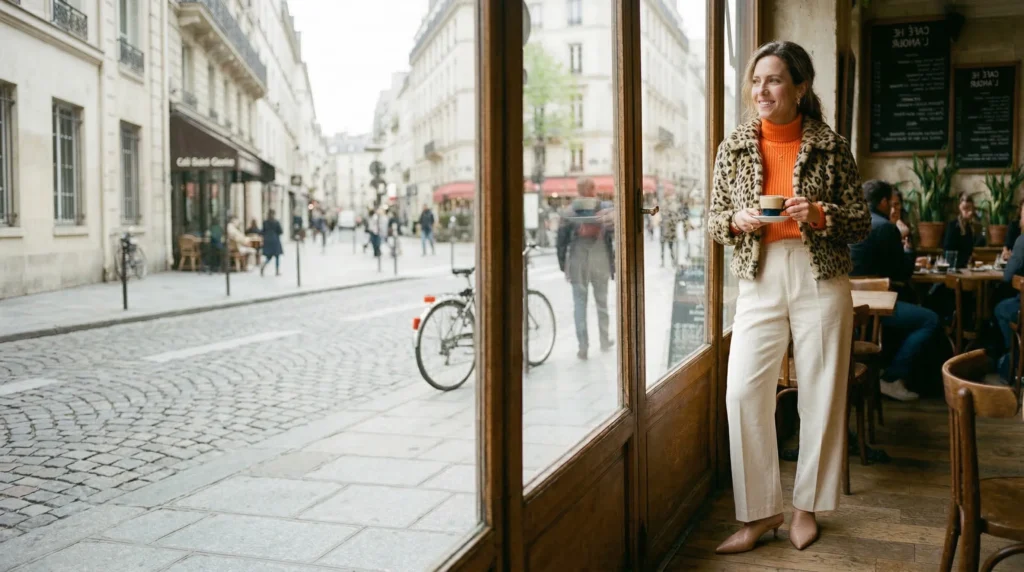 Soft Neutrals + Color PopMorning coffee runsLeopard jacket, orange knit, cream trousersPlayful & warm