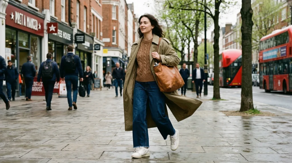 Now here’s where it gets interesting — each layer in this look works on its own. The trench handles rain and wind. The knit adds warmth. A roomy tote carries everything without fuss. This is smart transitional weather layering at its best.