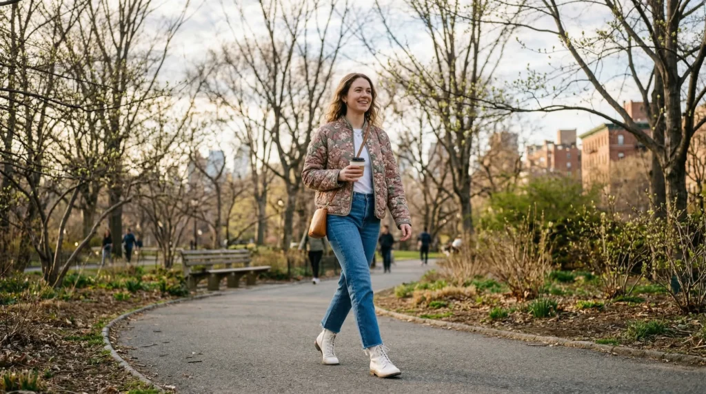Don’t sleep on floral outerwear. A quilted floral jacket over simple denim is one of those quiet, smart choices that works for long walks, weekend errands, or lazy afternoons when the air still bites.
