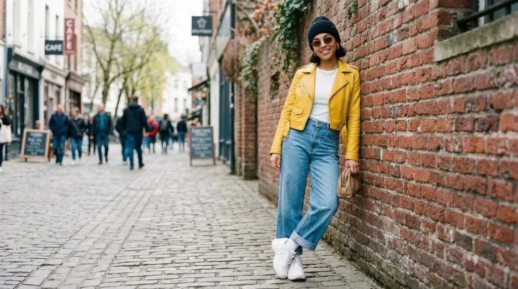 A bright leather jacket cuts straight through gray spring mornings. This is one of those statement spring outerwear looks that makes even the simplest pieces feel intentional. Think cropped yellow leather, wide-leg denim, a beanie, and tinted sunglasses.