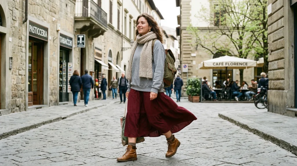 In my experience, this combination works brilliantly on travel days or long city walks. The scarf acts almost like armor against cold wind. Structured boots keep things grounded. A backpack adds practicality without killing the mood.
