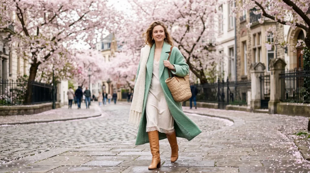 A mint-toned coat over a flowing dress sounds like a spring dream, and honestly? It kind of is. But here’s the thing — it’s also genuinely warm. The oversized scarf adds movement and insulation, and the boots bring everything back to earth.
