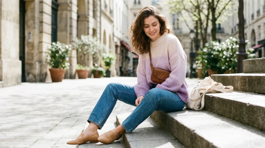 Ankle boots are the most versatile choice — they work with both skirts and jeans. Loafers are great as temperatures start to rise. Clean sneakers suit sporty or casual looks. Neutral tones like tan, white, or black keep the focus on the rest of the outfit.