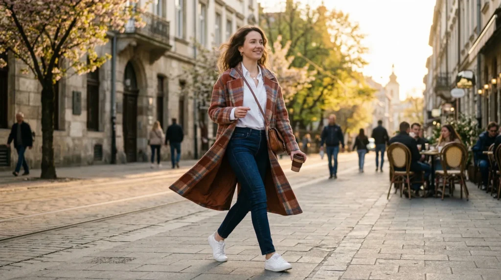 There’s a certain magic when the sun hits just right but the air still asks for layers. A softly structured plaid coat in warm oranges and muted blues brings that feeling to life. For trending cold spring outfit 2026 layered looks, plaids aren’t about nostalgia — they’re about atmosphere.