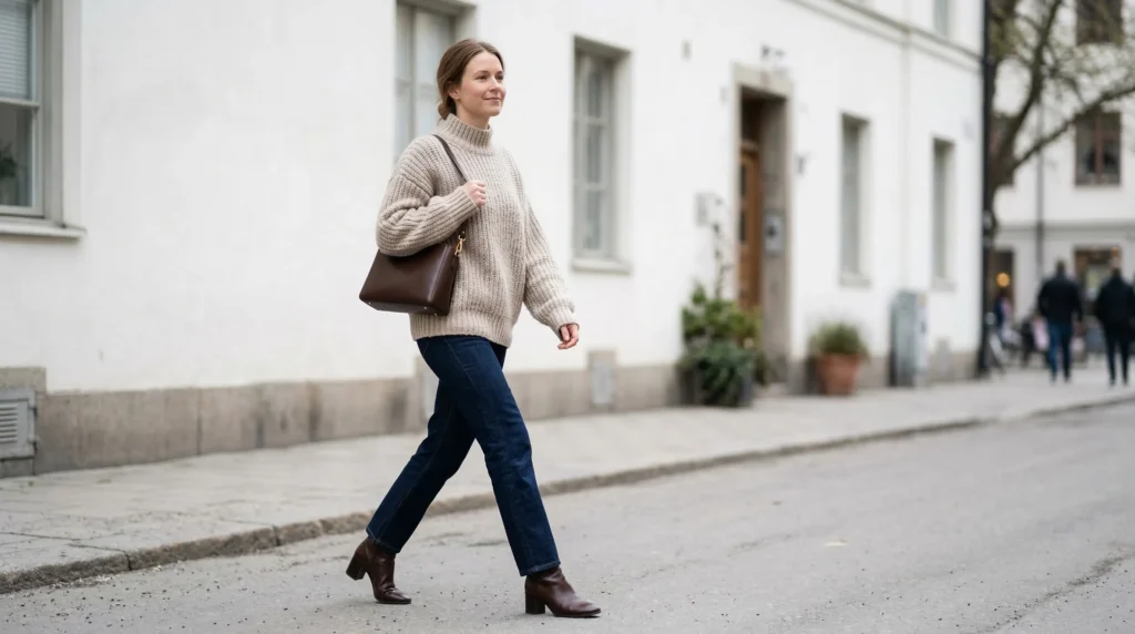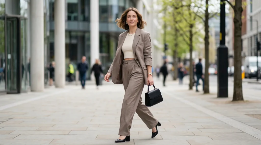 | Minimal neutrals | Neutral knit, denim, block heels | Office casual, meetings | Tone-on-tone restraint |