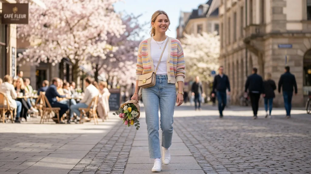 Ending on a softer note feels completely right for a spring 2026 street style guide. A cropped cardigan in gentle pastel stripes paired with light denim creates an outfit that’s cozy, optimistic, and quietly stylish — the kind of spring comfort outfit that you reach for repeatedly because it always feels right without ever feeling boring. It’s spring dressing at its most honest and its most appealing.