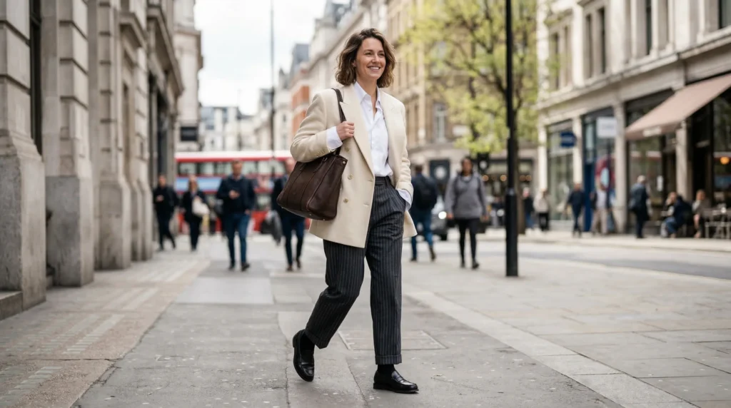 There’s something immediately grounding about this look, and it’s one of the strongest directions in trending spring outfits 2026 trends street style right now. An oversized blazer paired with a crisp white shirt and relaxed pinstripe trousers feels borrowed from a menswear wardrobe — but styled in a way that’s undeniably modern and feminine. It’s tailoring that doesn’t try to be corporate or stiff. It just looks confident.
