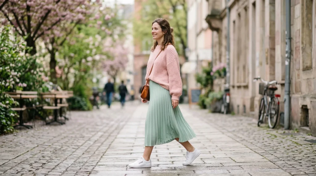 This look feels like spring finally exhaling, and it’s one of the most genuinely wearable spring 2026 street style trends on this list. An airy oversized knit in a soft pastel tone paired with a fluid pleated midi skirt reads calm, approachable, and quietly optimistic. Sneakers ground the whole look in real life rather than aspirational dressing — and that combination of softness and practicality is exactly what 2026 spring fashion keeps coming back to.