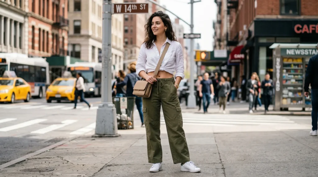 | Utility chic | Cargo trousers, cropped shirt | City errands, casual days | Functional pockets |