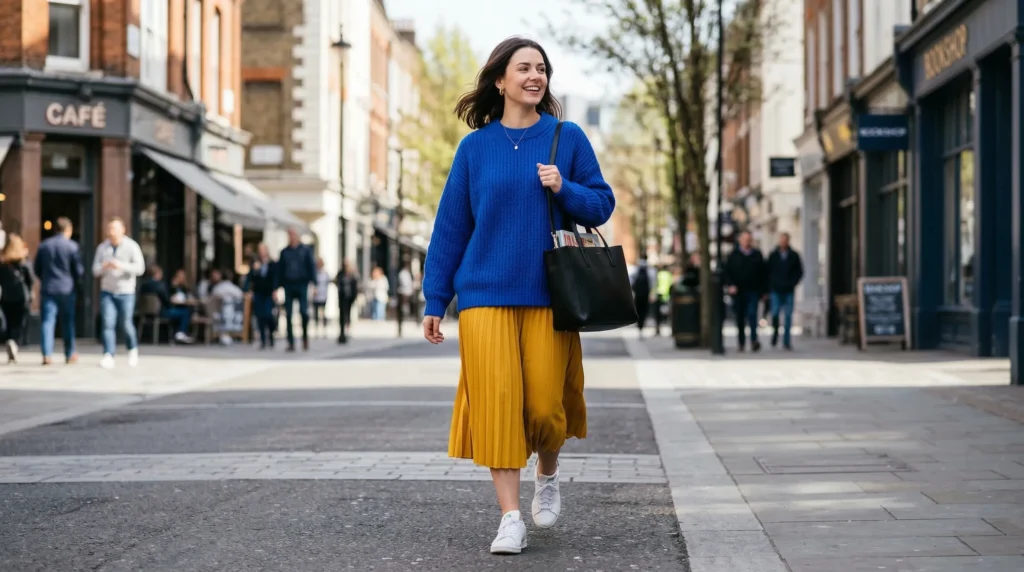 Now here’s where it gets interesting: color blocking works in 2026 because the rest of the outfit stays completely restrained. The sweater does most of the talking. Everything else — the skirt’s clean lines, the simple sneakers, the minimal jewelry — exists to support rather than compete. That discipline is what separates a great color-blocked look from a chaotic one, and it’s a principle worth holding onto.