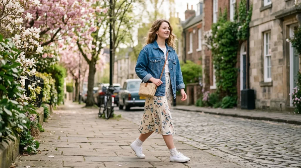 | Denim layering | Denim jacket, midi skirt, sneakers | Morning walks, errands | Denim over soft fabrics |