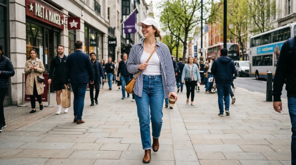 There’s something effortlessly cool about this combination that keeps showing up across trending spring outfits 2026 trends street style, and it’s not hard to understand why. Denim, a simple tank, an oversized striped shirt worn open as a lightweight jacket, and a baseball cap create a look that feels urban, approachable, and completely current. It’s casual, but there’s a clear point of view behind every single choice.