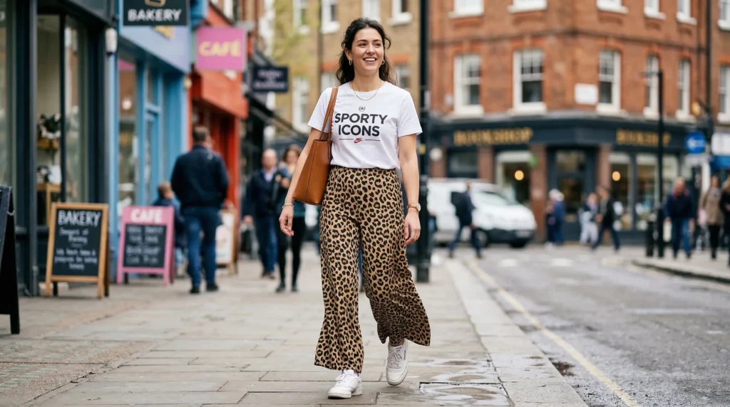 This look leans confidently into contrast — which is one of the defining qualities of trending spring outfits 2026 at their most interesting. A classic graphic or logo tee paired with wide-leg animal-print trousers feels unexpected but completely balanced. It’s playful and a little rebellious, but the styling keeps it from tipping over into costume territory. That restraint is everything.